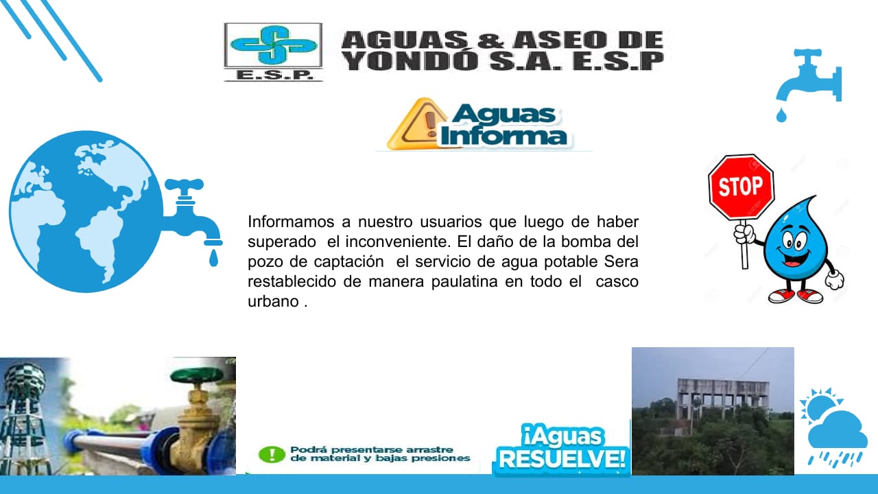 Informamos a nuestros usuarios que luego de haber superado el conveniente, el daño de la bomba del pozo de captación el servicio de aguas potable será restablecido